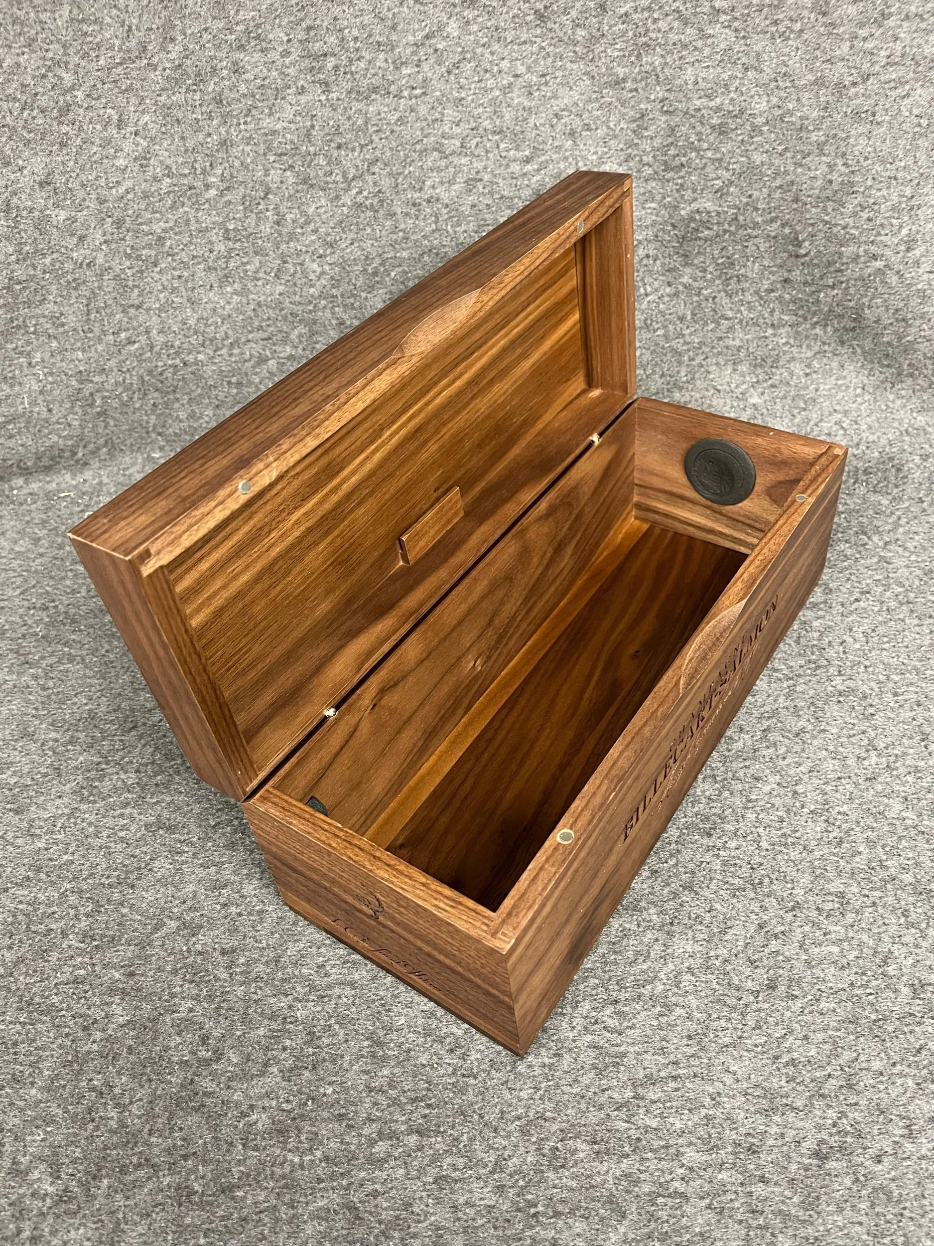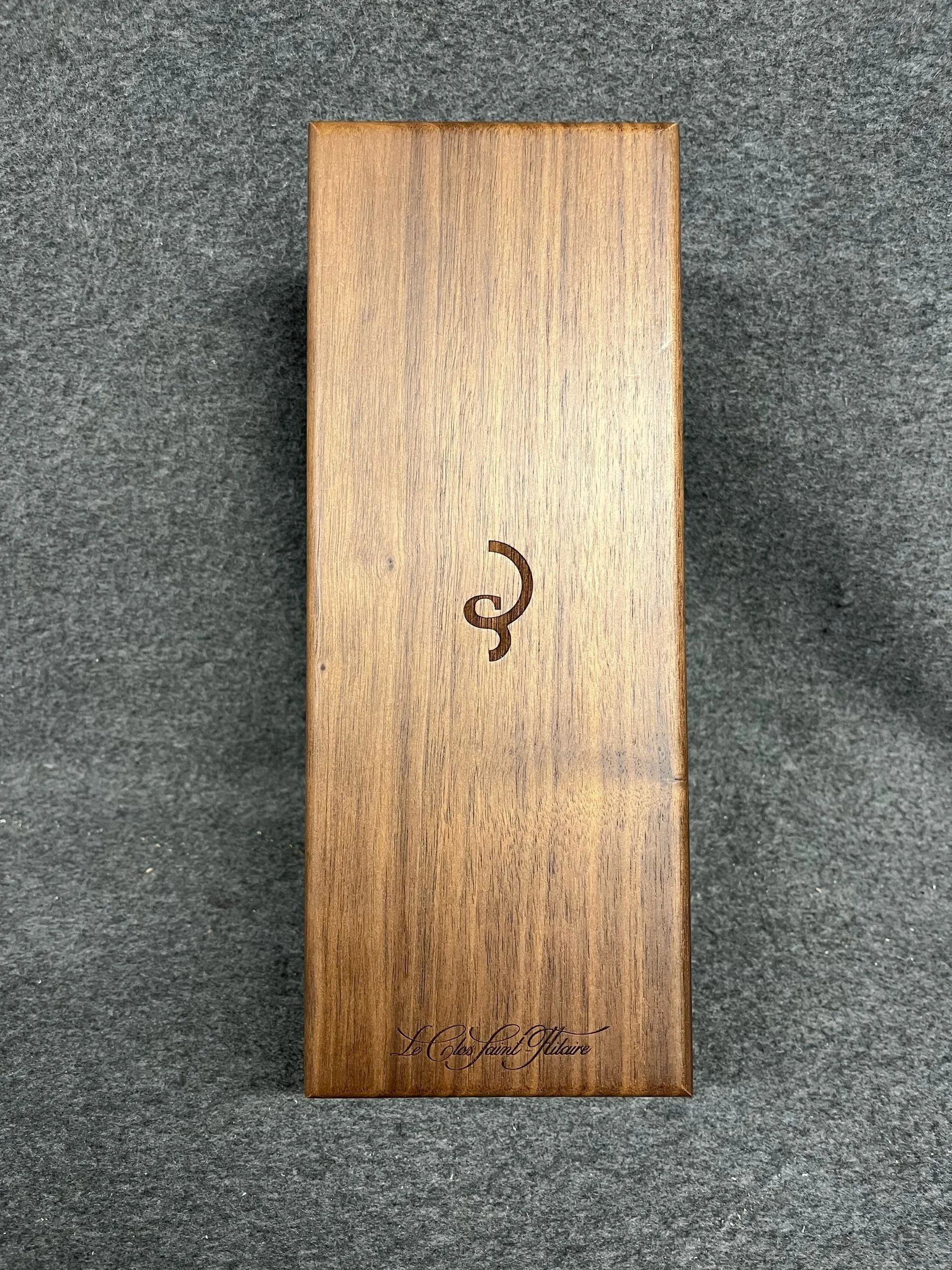 Single champagne bottle box with soft close and engraved vineyard name and logo